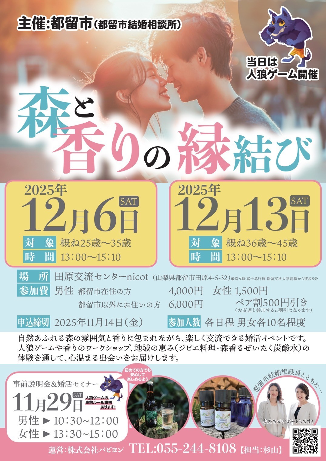 2024/11/17 | ~峡東3市主催「香りと果実の縁結び」開催~ 男性37名×女性32名の大規模イベントを開催!香水作り体験を楽しみながら素敵な出逢いを叶えるイベント♡11組のマッチングが成立しました! |